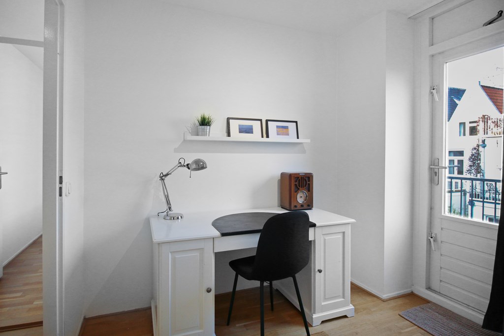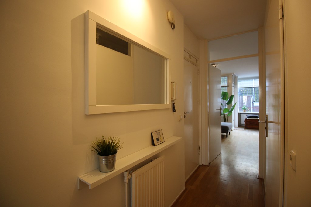 Entree naar eerste verdieping van het appartement, via de hal toegang tot de Ruime woonkamer die aan de straatzijde is gelegen, via de woonkamer toegang tot de vernieuwde keuken met inbouwapparatuur. De hal leidt naar de achterzijde alwaar zich twee kamers bevinden. Een dient als ruime slaapkamer, de andere kamer is in gebruik als studeerkamer. Beide kamers hebben toegang tot het achtergelegen balkon. De badkamer is compleet vernieuwd en voorzien van een inloopdouche en stijlvol wastafelmeubel, ook zijn hier de wasmachine en droger te vinden. Het toilet is separaat.